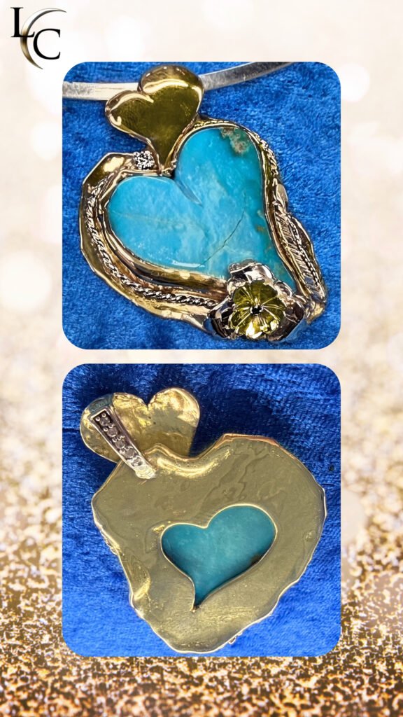 But it is the center of the pendant, the heart itself, that transforms precious jewelry into something closer to a living heirloom. Set at the center is a 34.5-carat heart-shaped Ithaca Peak turquoise, a gem hailing from Arizona’s sacred mining grounds. Ithaca Peak turquoise is instantly recognized by aficionados for its deep, electric blue—a color layered with spiritual significance among Native peoples. To choose this particular stone is to choose history, to select for a kind of spirit as much as for color or clarity.