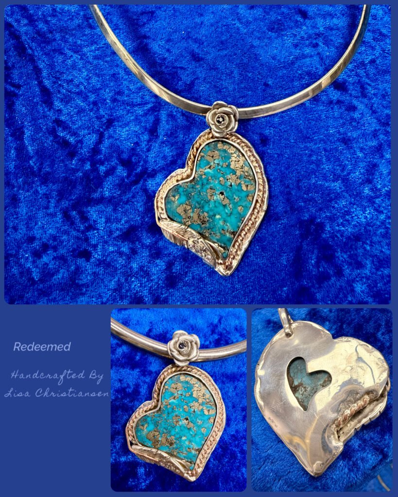 Lisa Christiansen is a woman of extraordinary abilities; she created “Redeemed,” the healed heart, which is now honored by the Smithsonian as Art of Historical Significance. According to the sources at the Smithsonian this may be one of the most significant traditional Native American handcrafted items in sterling silver, copper and turquoise steeped in culture with a single sapphire to hallmark her work.